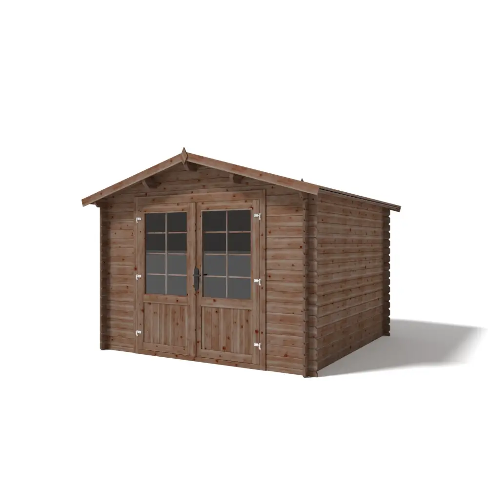 Sur les photos, il y a un chalet en bois DOM427 d'une superficie de 9m2. Dimensions au sol : L 3m et P 3m.