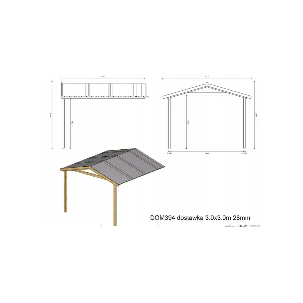 Abri + terrasse et avant-toit - abri d'une superficie de 18 m2, une largeur de façade de 3 m, une profondeur de 3 m et une épaisseur de parois de 28 mm.
