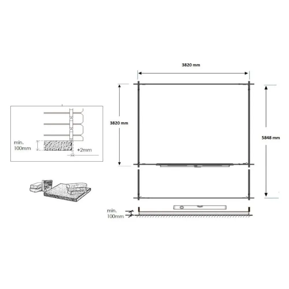 Abri + terrasse et avant-toit - abri d'une superficie de 24 m2, une largeur de façade de 4 m, une profondeur de 4 m et une épaisseur de parois de 28 mm.