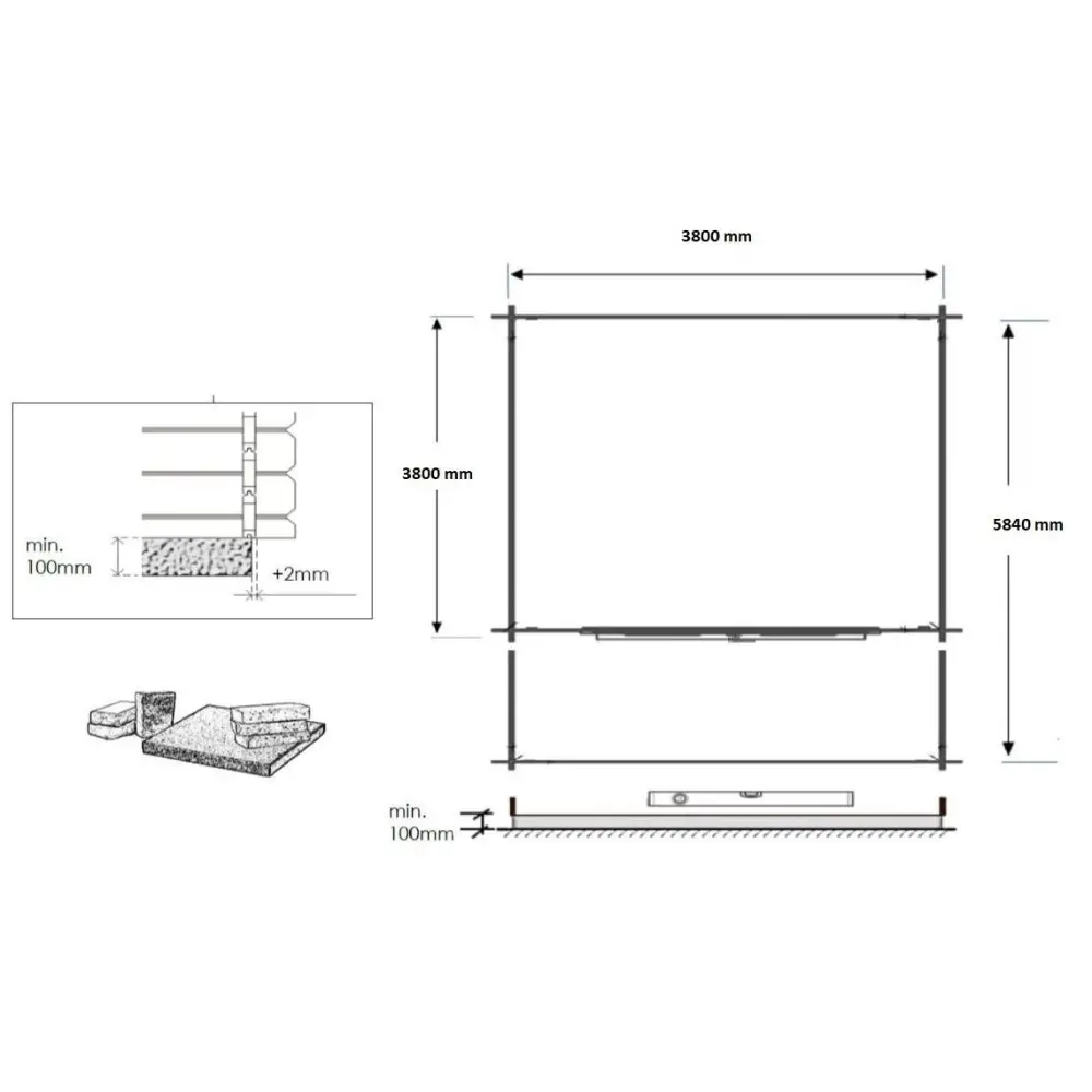 Abri + terrasse et avant-toit - abri d'une superficie de 24 m2, une largeur de façade de 4 m, une profondeur de 4 m et une épaisseur de parois de 40 mm.