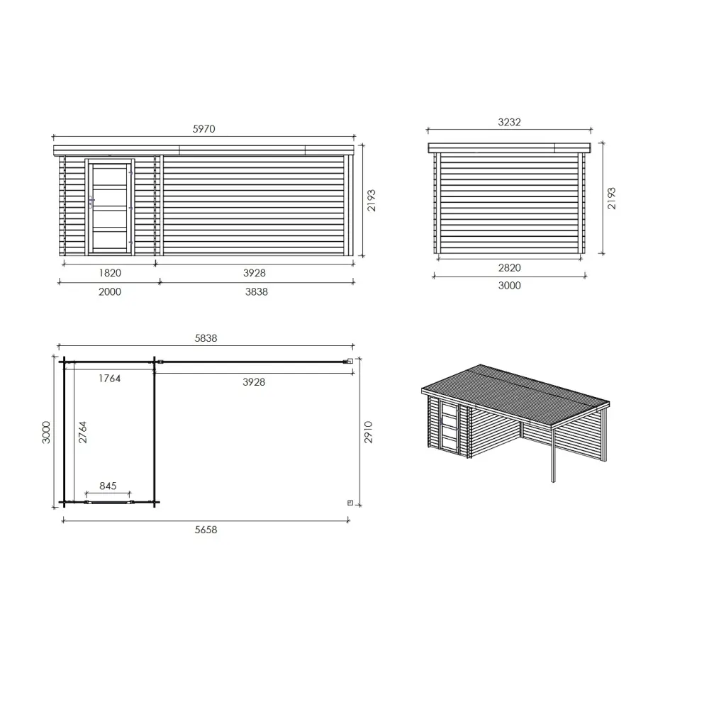 Sur les photos, il y a un chalet en bois DOM695 d'une superficie de 6m2. Dimensions au sol : L 5.84m et P 3m.