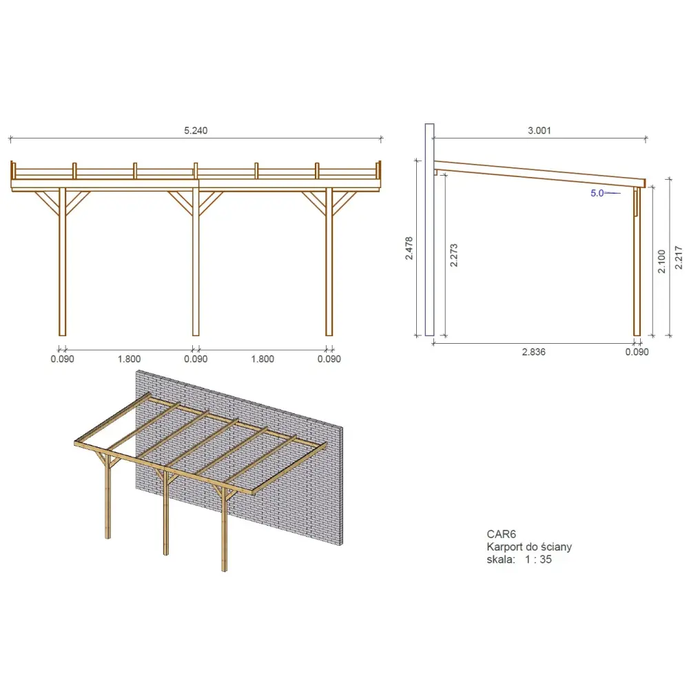 Le carport proposé CAR6, d'une largeur de 3 m et d'une profondeur de 5.24 m, avec une hauteur d'entrée de 2.1 m, peut être utilisé comme abri de voiture ou par exemple comme abri de terrasse. L'assemblage du carport avec les instructions incluses ne pose pas de problème.